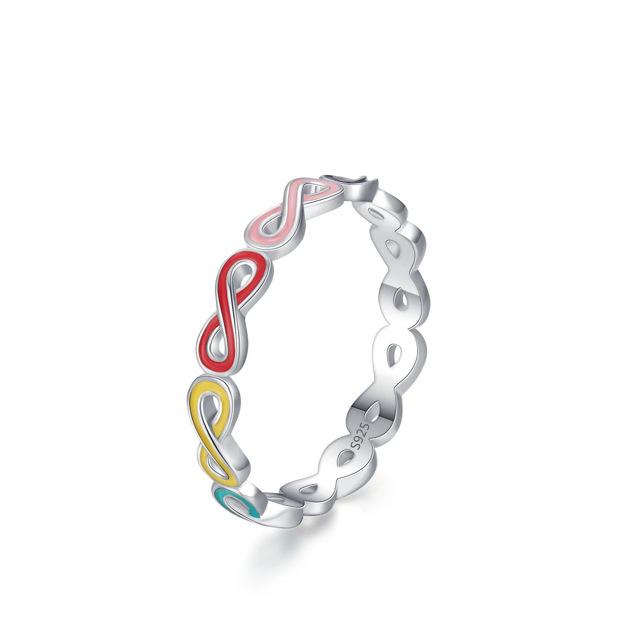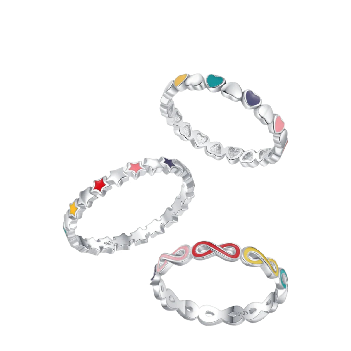 Delicate and vibrant, these stackable rings crafted from 925 sterling silver feature heart, star, and infinity motifs with rainbow enamel—perfect for expressing your unique style.